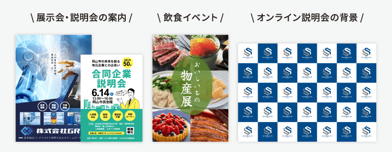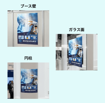 特に展示会の案内や会社説明会など、ブースの壁面を目立たせたい場合はA1(841mm×594mm)サイズ、柱や狭い壁面に設置する場合は、A4(297mm×210mm)サイズがおすすめです。