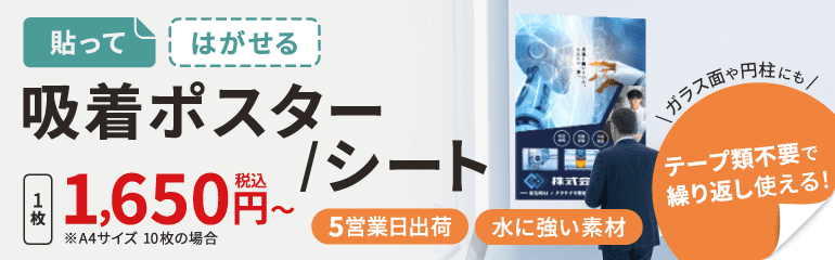 吸着ポスター・シートは、吸着面がミクロの吸盤のような構造になっており、壁面をはじめ、ガラス面などへの貼り付けが可能です。 ガラス面や曲面にも対応できるため、展示会ブースでの案内表示や、飲食店イベントなどの期間限定掲示にもご利用いただけます。