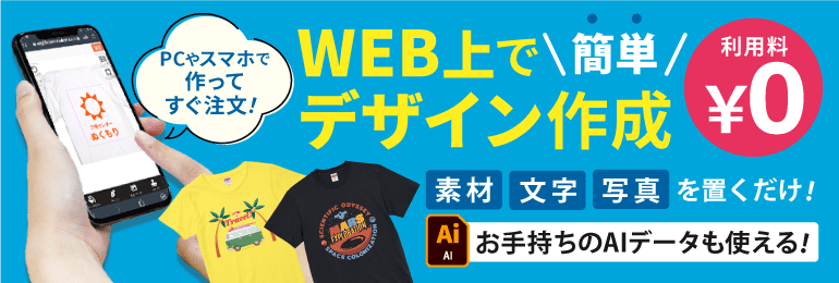 Web上で文字やイラスト、写真などを自由に配置してデザインが可能です。作成したデザインの仕上がりイメージを確認してすぐにTシャツやキャップなどの商品が注文可能です。