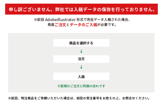 過去に「完全データ入稿(Adobe illustrator形式)」「Web上デザイン(のぼりデザイン)」でご注文いただいた方は、この増刷依頼ページをご利用いただけません。下記をご参照ください。